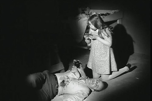 In the opening scene, Barbra and her brother Johnny are visiting their father’s grave (and Johnny’s being a real pill about it, by the way) when a ghoul approaches and… goodbye Johnny. Barbra runs to a farmhouse, chased by the undead, and holes up, soon to be joined by a stranger named Ben. Ben keeps his calm and has a plan to board up and defend the farmhouse, while Barbra becomes hysterical and then catatonic. It turns out that they have company: another group of frightened (living) people were already hiding in the basement. There’s a young couple, and an older married couple with an injured daughter. The movie covers just the one night, in which the zombies, I mean ghouls, mill about outside and the people inside make plans to escape. The radio and television inform them that there is an epidemic of ghouls ravaging the country, killing people and eating them.