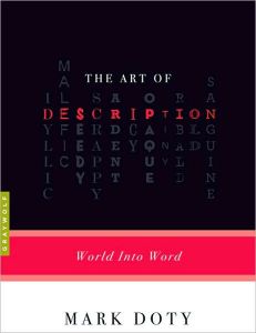 Okay, enough parentheticals. The Art of Description is both an enjoyable read and a useful craft book. I appreciate its balance of quotable moments, profound concepts, and nuts-and-bolts writing advice. I also appreciate its illumination of Doty’s working style, because I plan on focusing partly on his work for my critical essay this semester. He includes as well plenty of examples from other writers’ (mostly poets’) work, with close readings, and one large section of this slim book is an alphabetical list of elements of description, which I think must have been fun to put together.